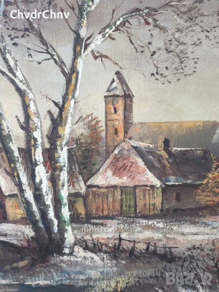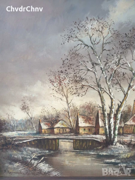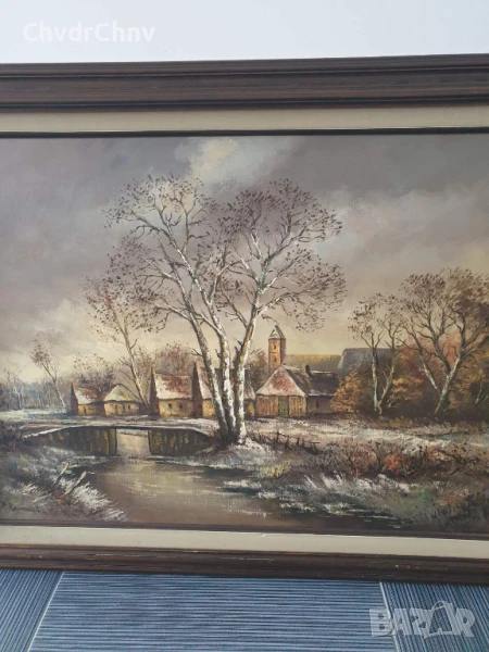120х90см/стара голяма картина масло върху платно/пейзаж/село-река-мост/дървена рамка