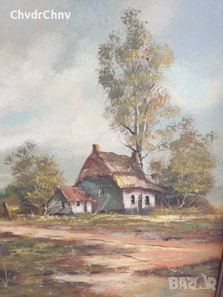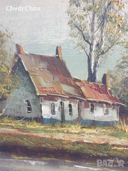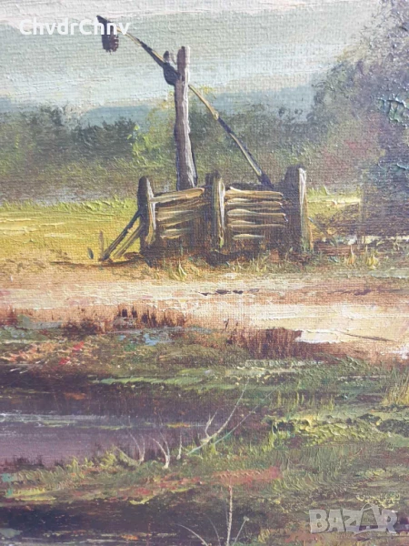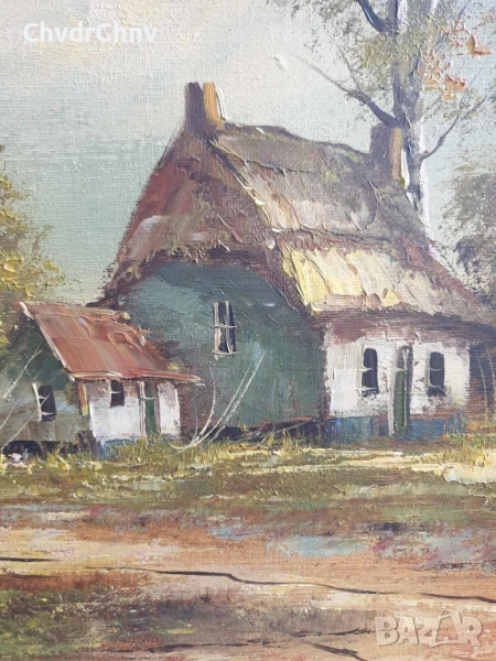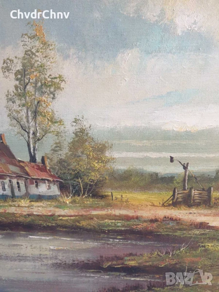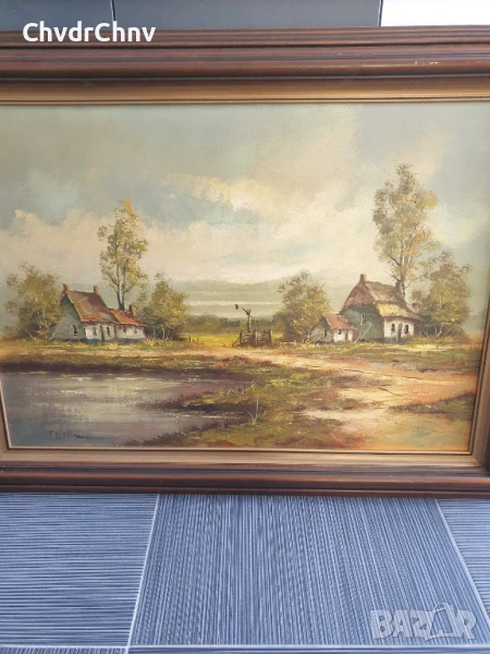 122х92см/стара голяма картина масло върху платно/пейзаж/къщи-кладенец/дървена рамка