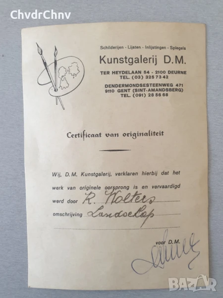 Картината е с документ че е закупена от арт галерия в Гент, Белгия (последната снимка), съдържа и името на художника но не го разчитам.