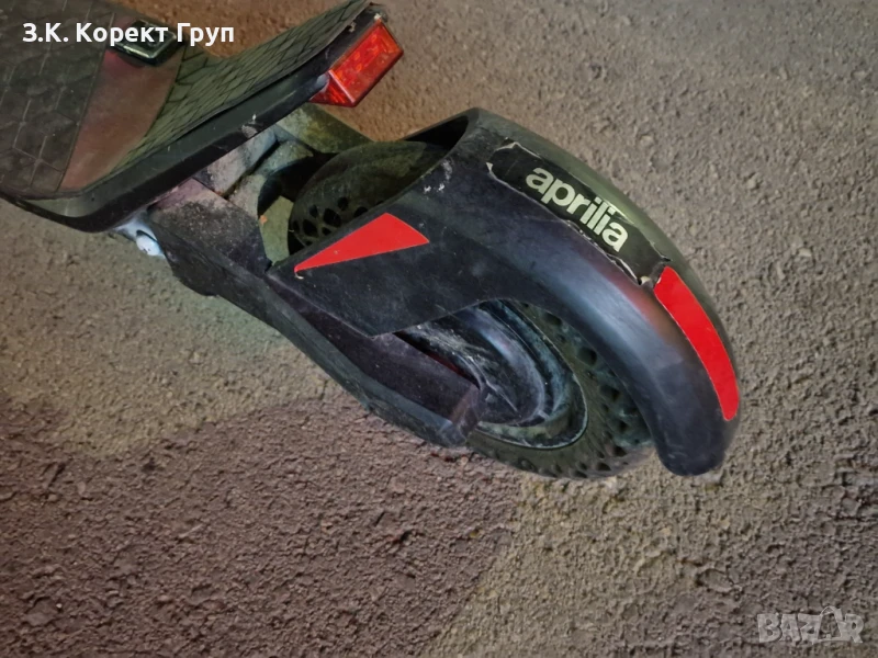 тротинетка APRILIA E-SR2 TS, леки нормални следи от употреба, но нищо сериозно, което да нарушава търговския й вид. Не е претърпявала инциденти. Развива до 25 км/ч и е с пробег до 25 км с пълен заряд в зависимост от терена и начина управление.