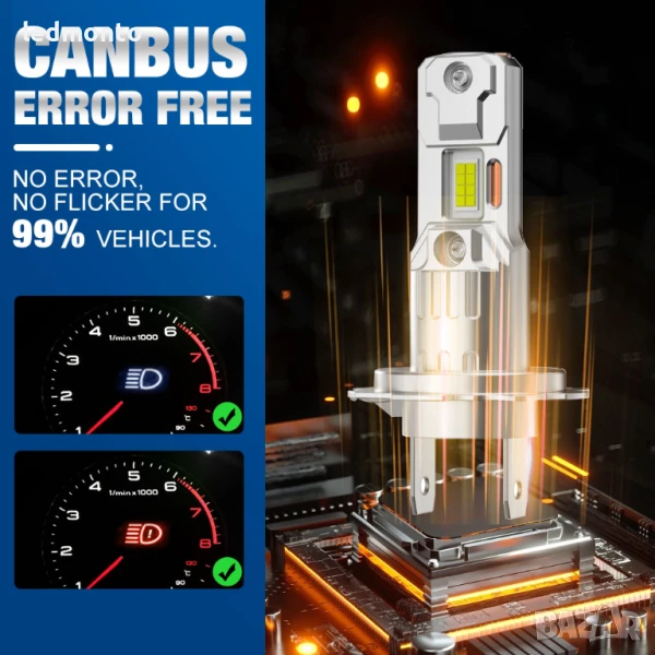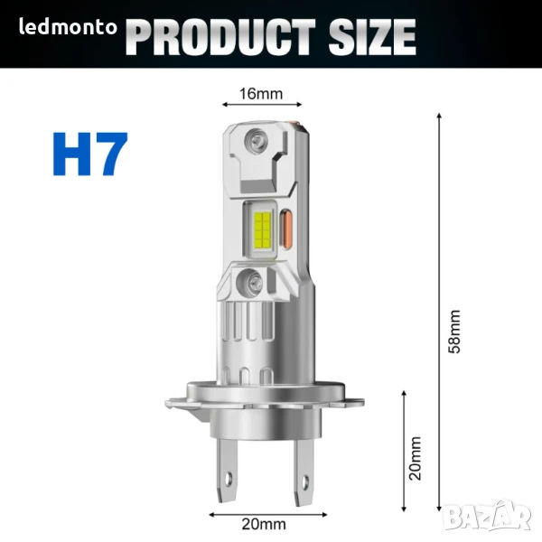 Чисто нови LED крушки тип H7 за фарове. Мощност 110W (22000 лумена на чифт), температура на светлината 6500K (студено бяла). Снабдени с 16 високоефективни CSP чипа и Canbus система – минимизират грешки на бордовия компютър. Компактни размери 1:1 като при стандартни халогенни крушки – за директен монтаж. С алуминиев корпус и вградена медна тръба за ефективно охлаждане. Водоустойчиви IP68. Подходящи за 12V системи.