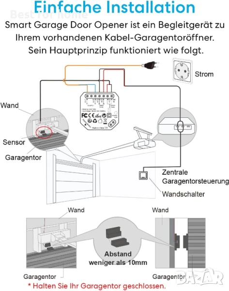 Релеен модул за всеки отварач за гаражна врата WLAN – Универсален сух контакт, съвместим с 230 V; Лесен 15-минутен монтаж на вашата гаражна врата с Wi-Fi