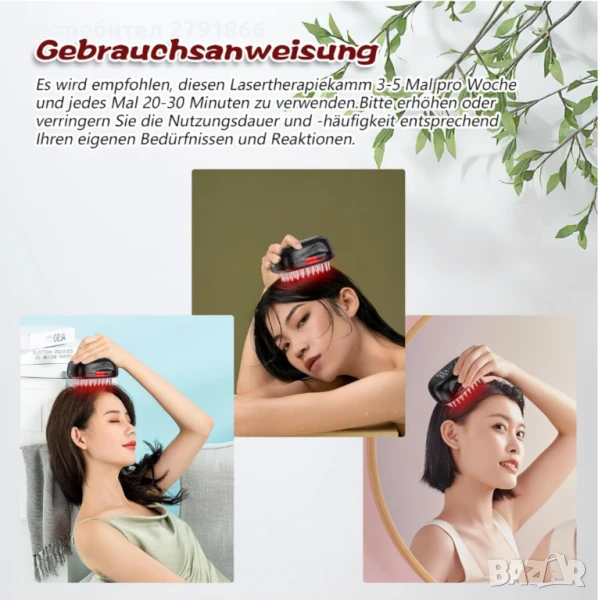 - 【Инструкции】Препоръчително е да използвате това устройство 3 пъти седмично, през ден, с интервали от 11 минути за всяка процедура. Моля, бъдете търпеливи и използвайте този лазерен гребен поне 16 седмици за максимален ефект, тъй като възстановяването на косата отнема време.