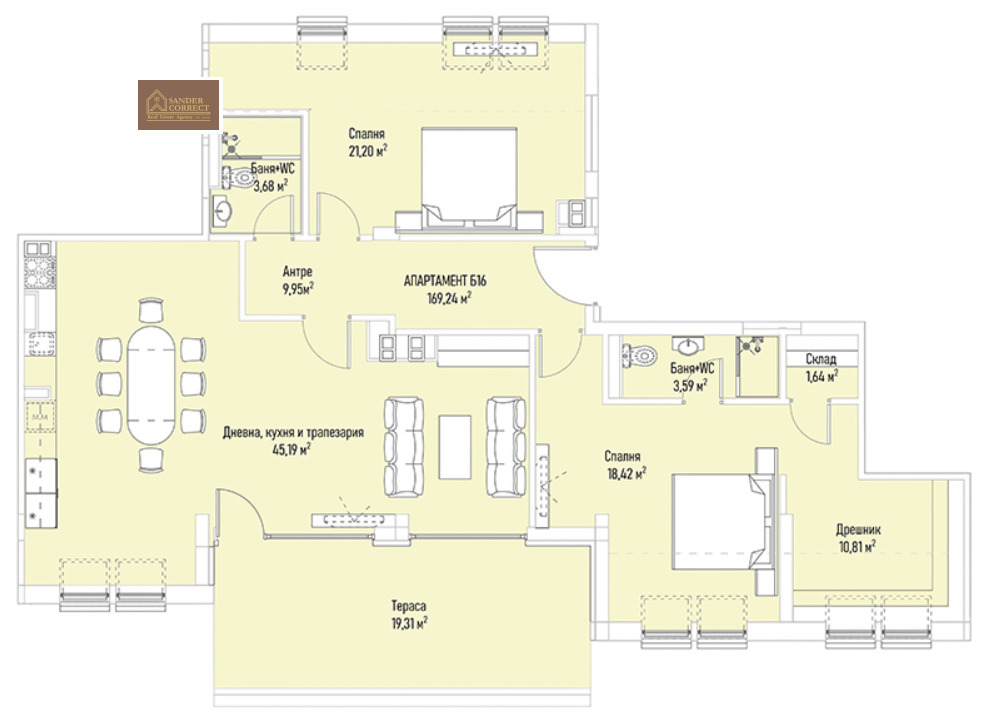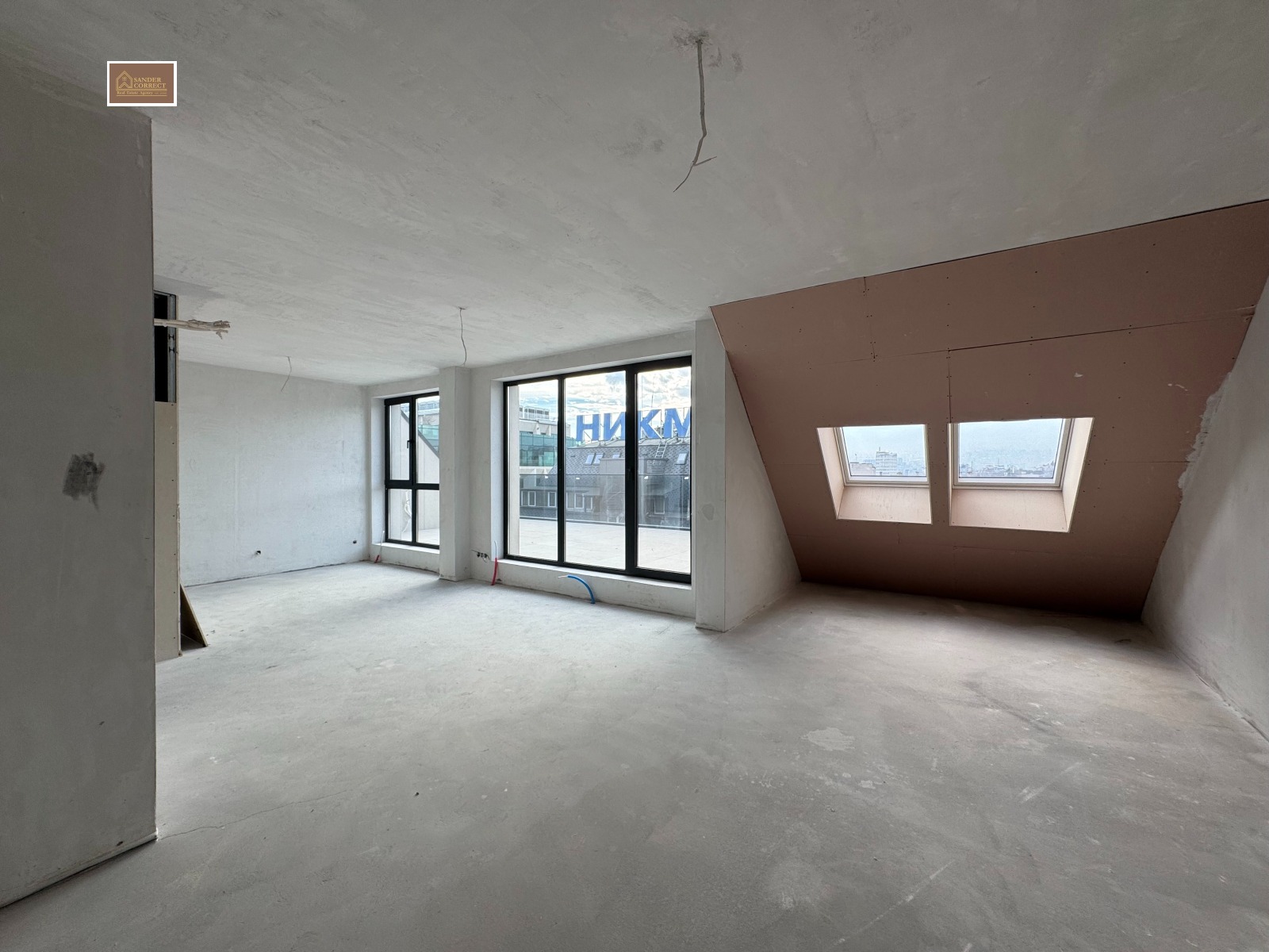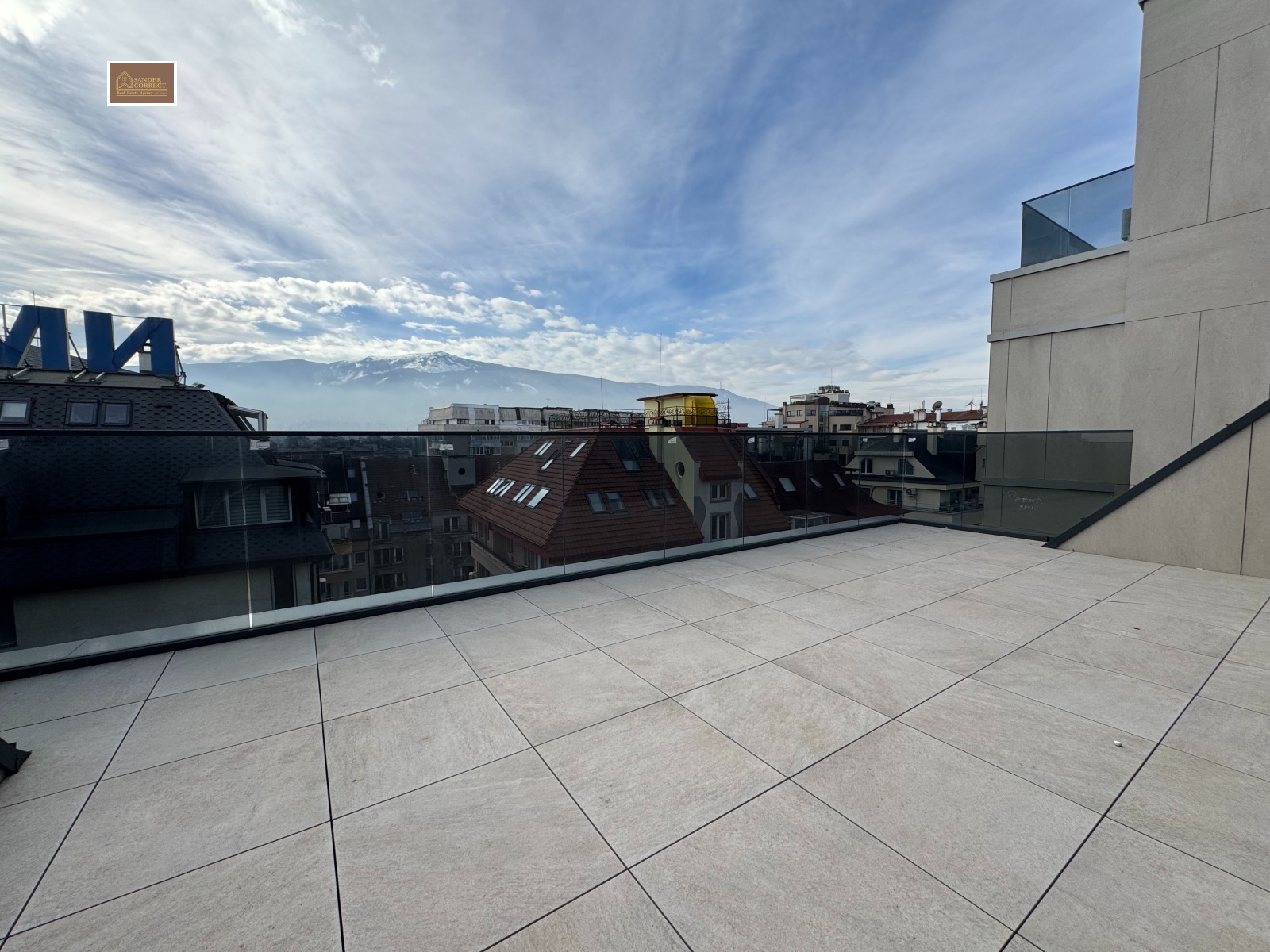 Апартаментът е със ЗП от 170 кв.м и се намира на 7-ми етаж и е със изложение юг/изток. Зашеметяващи гледки към природен парк Витоша. Разпределението е както следва: Вход, коридор от който в ляво се влиза в спалня със собствена баня, дрешник и склад; направо по коридора в дясно се влиза във втората спалня, а до нея е втората баня. Срещу нея е просторна дневна, който разкрива величествена гледка към Витоша планина и Лозенец, с прилежаща тераса с площ 19,31 кв.м. и високи тавани 2,85 м.