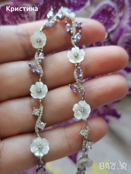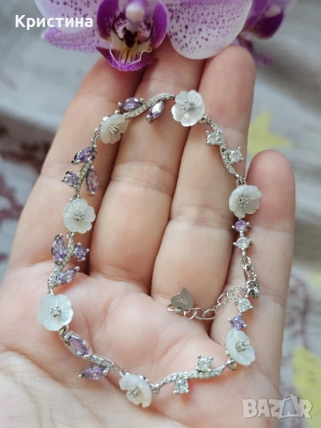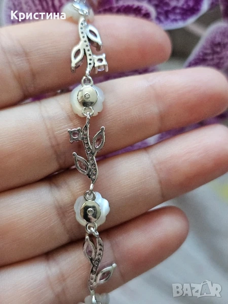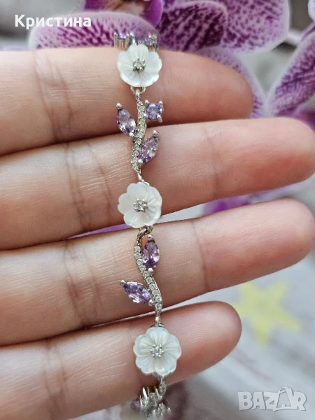 Много красива нова италианска сребърна гривна с цветя Седеф. Проба: 925. Дължината може да се регулира от 20 до 23 см. Забележка: липсват 2 малки циркона (вж. на последната снимка) и цената е съобразена с това.