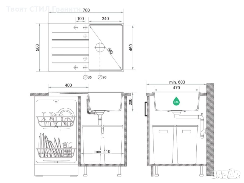 Зелената линия показва необходимото пространство в мм за монтаж на мивката в шкафа !!!