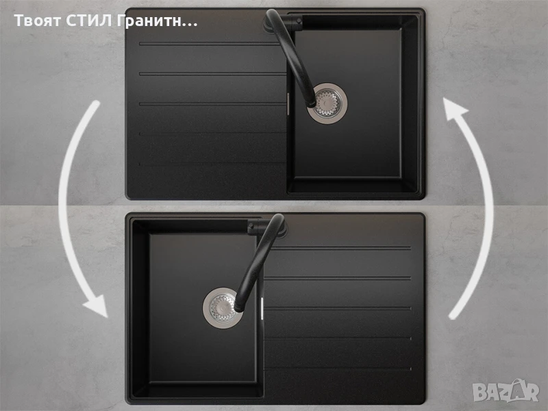 - Гъвкавост на дизайна - мивката е въртяща се - отцедникът може да се монтира отдясно или отляво