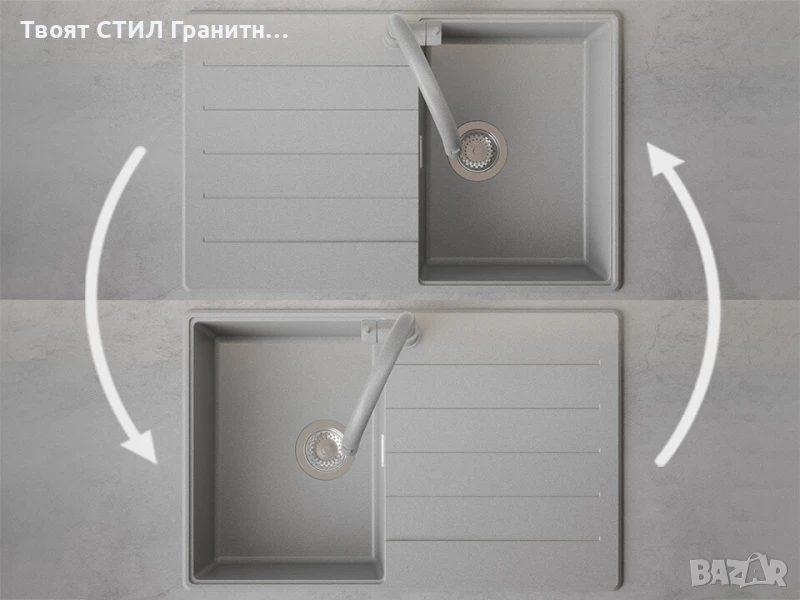 - Гъвкавост на дизайна - мивката е въртяща се - отцедникът може да се монтира отдясно или отляво