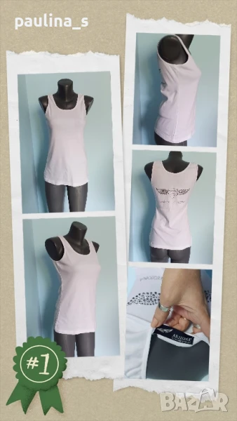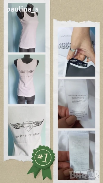 1️⃣. Колаж / L / 3XL - "Arizona". Цената е крайна 19,99лв. Памучен марков потник тип туника. Материята е 100% памучно трико, доста еластична и покрива няколко размера до 3XL. Декорация с камъни отзад, втален силует, класика в жанра. Като нов, без дефекти и етикет.
