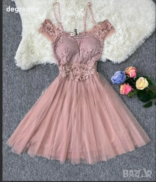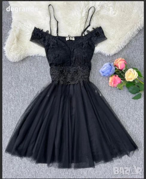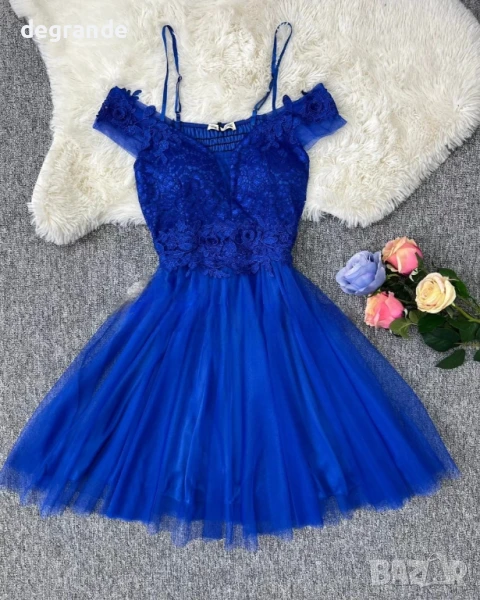 Дамска рокля с тюл и дантела налична във Черно Кралско синьо и цвят Пепел от рози. → Обява 51142907
