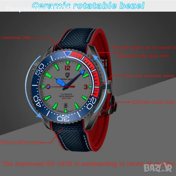 водоустойчив, дата, керамичен въртящ се безел, фосфорисциращи стрелки,