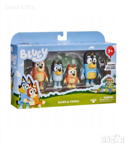 Включва четири любими героя от популярното детско анимационно филмче – Bluey, Bingo, мама Чили и татко Бандит.
