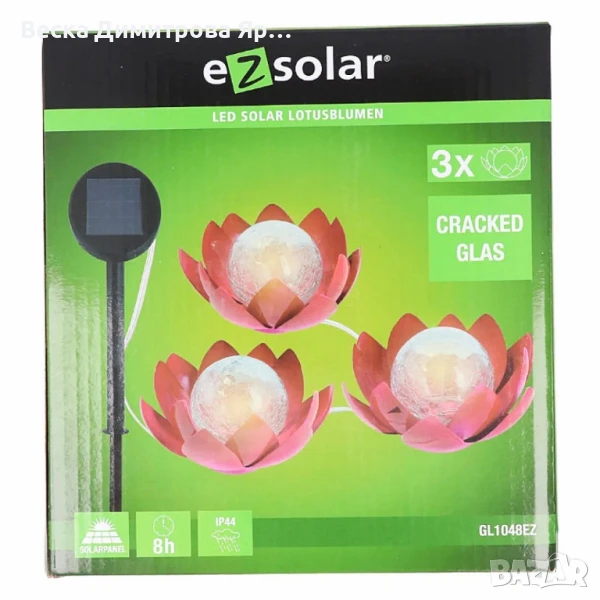 LED слънчев градински соларен панел с 3 светещи лампи цветя Цена: 27 лева Вграден соларен панел; Три LED светодиода във всяка лампа; Светлина: Топло бяла (2200-3000 К); До 8 часа осветление на ден; Включва стандартни 300mAh 1.2V AAA NiMH батерии; Превключвател за включване/изключване и сензор за здрач; Включен земен шип за лесно закрепване; Приблизителни размери: Диаметър на цветето 12 см; Гаранция: 12 месеца.