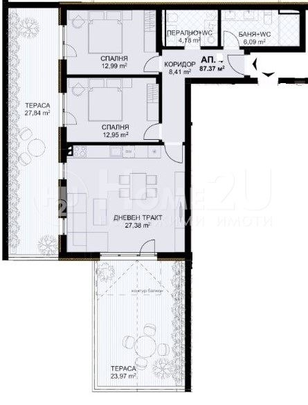 Разпределението на апартамента е следното: коридор, всекидневна, две спални, баня с тоалетна, перално помещение, 2 големи тераси!