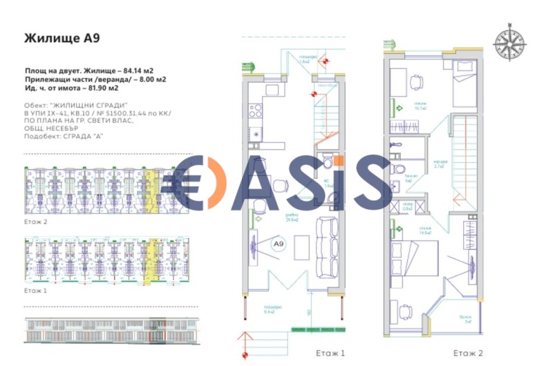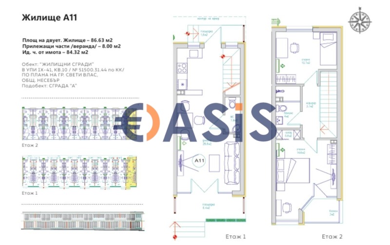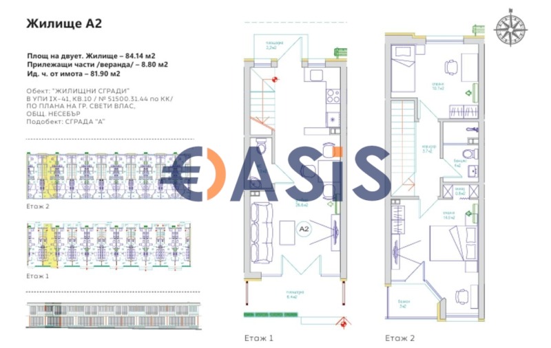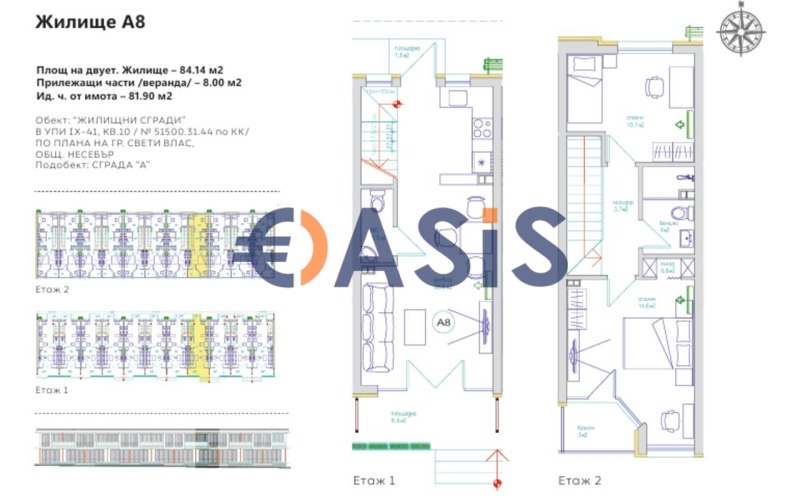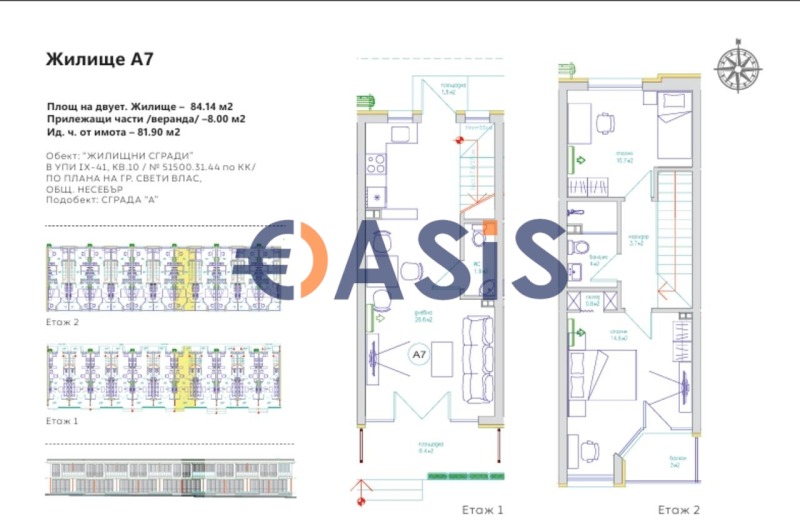 Продават се двустайни апартаменти в новия и модерен комплекс Съни Айо в Свети Влас. Площта на апартаментите е от 84.14 кв.м. и е разпределен както следва: входно антре, хол с кухня, две спални, две бани с тоалетна и балкон. Апартаментите се продават до ключ без кухня и климатик. Собствениците имат възможност за закупуване на паркомясто.