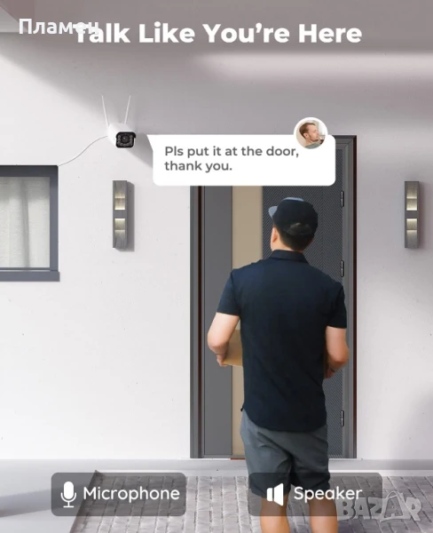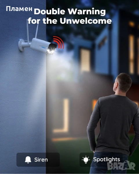 • Вграден прожектор и сирена, които могат да се активират автоматично или ръчно за ефективно отблъскване на нежелани посетители .