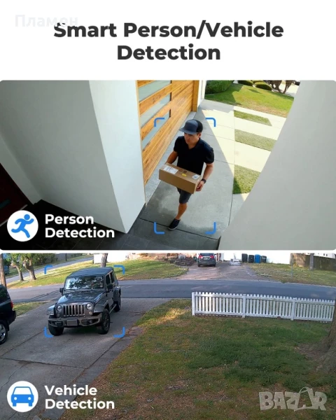 • Разпознаване на хора и превозни средства с вградена AI технология, което значително намалява фалшиви аларми (без необходимост от абонамент) .
