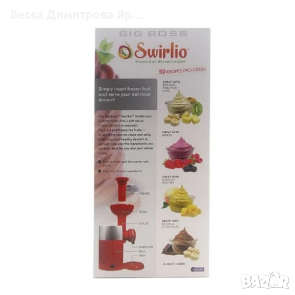 те Десерт мейкър, уред за сладоледи - Big Boss 9249 / Цвят: Според наличността в склада/ Размери на продукта: 12.7 см х 25.5 см x 34.4 см. / Мощност: 480 W;