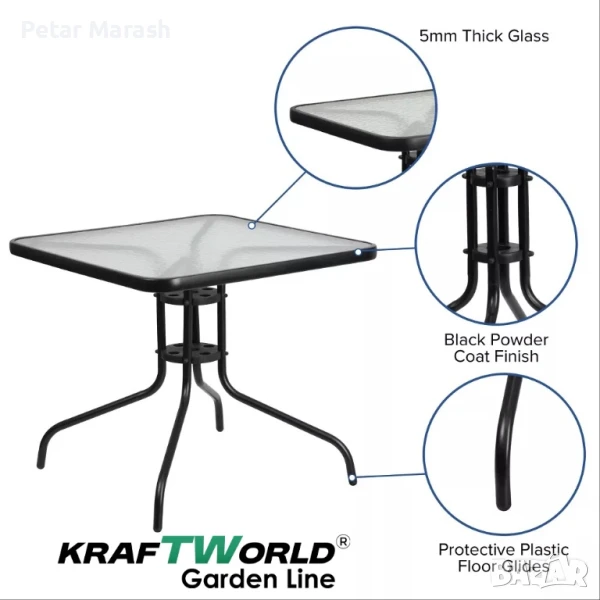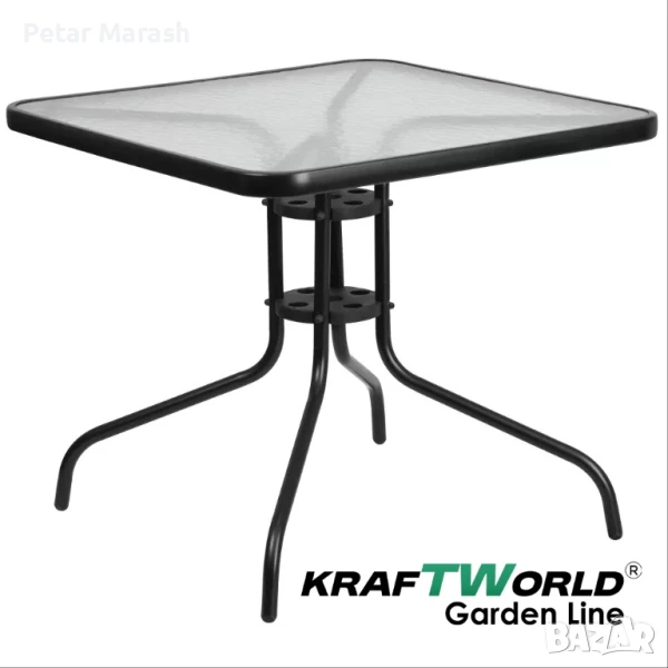 🪟 Масата е с компактни размери 80 x 80 x 70 см – квадратна форма, с метална рамка и термообработен стъклен плот, устойчив на атмосферни влияния. Централният отвор в плота позволява поставяне на чадър, ако желаете сянка.