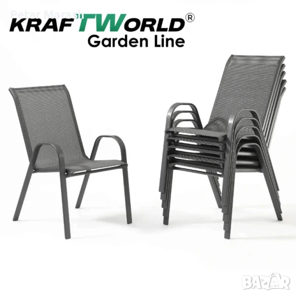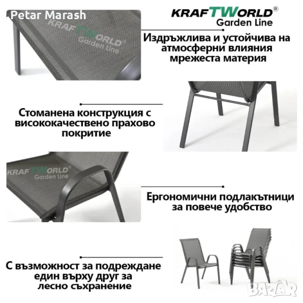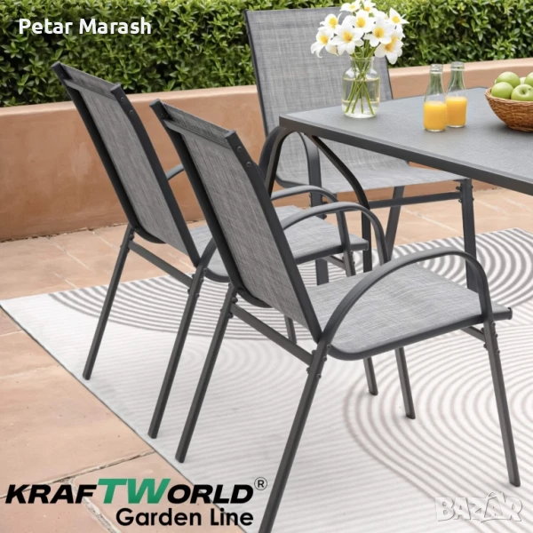 🪑 Столовете са същите като в по-големия комплект – изработени от здрав метал и обтегнат текстилен плат, който е устойчив на UV лъчи и влага. Облегалките са леко наклонени за повече комфорт при сядане, а конструкцията е лека и стабилна.