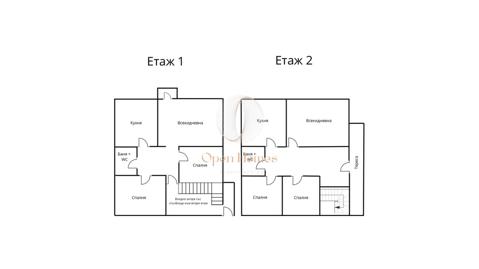 Първи етаж: входно антре, коридор, всекидневна, кухня, две спални, баня с тоалетна, директен достъп до двора, вътрешно стълбище;