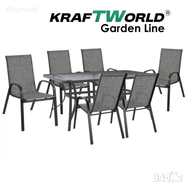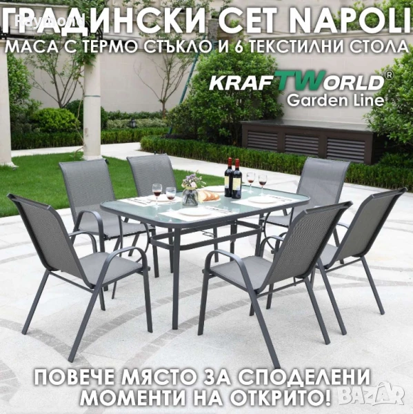 Метален Градински сет Napoli 7 части – Маса с Термо Стъкло и 6 Текстилни Стола