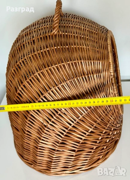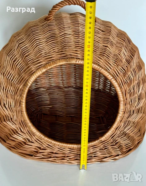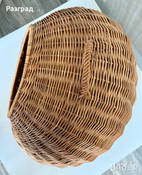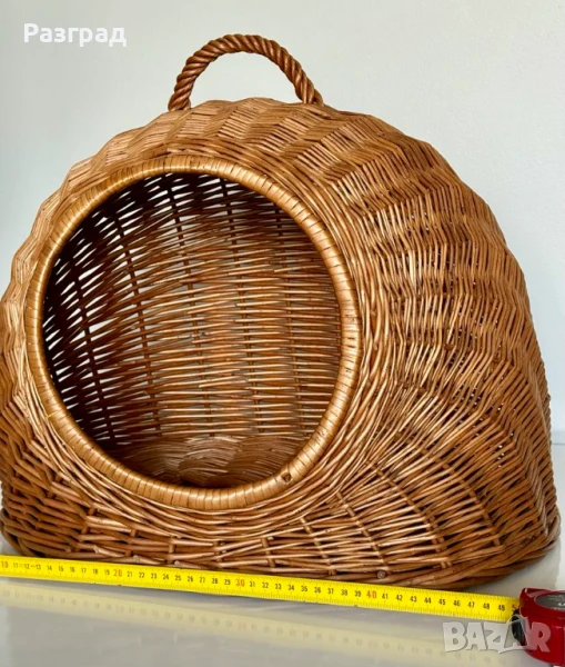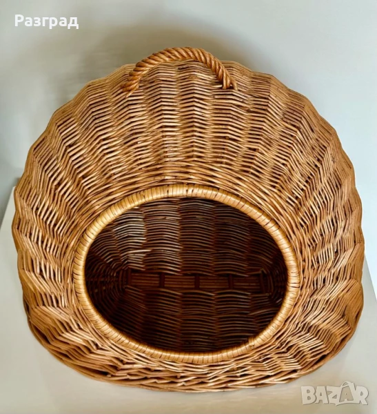 Практично и стилно плетено легло-кош за домашни любимци, подходящо за котки или малка порода кучета. В много добро използвано състояние и без дефекти. Ръчно изработено от естествени материали (плетиво от ракита) в натурално кафяв цвят. Със здрава и стабилна дръжка в горната част за безпроблемно преместване.