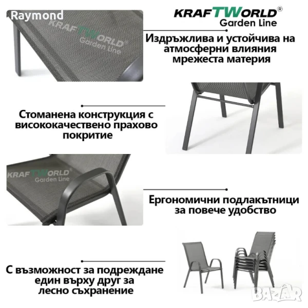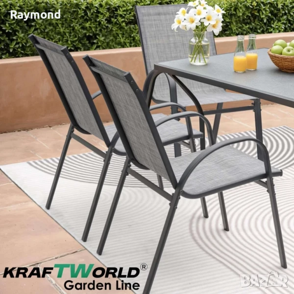 градински комплект Sorento – стилно и практично решение за вашата тераса, веранда или балкон. Подходящ както за малки открити пространства, така и за уютни кътове за кафе и отдих, Sorento съчетава устойчиви материали и елегантен минимализъм. 🪑 Столовете са същите като в по-големия комплект – изработени от здрав метал и обтегнат текстилен плат, който е устойчив на UV лъчи и влага. Облегалките са леко наклонени за повече комфорт при сядане, а конструкцията е лека и стабилна. 🪟 Масата е с компактни размери 80 x 80 x 70 см – квадратна форма, с метална рамка и термообработен стъклен плот, устойчив на атмосферни влияния. Централният отвор в плота позволява поставяне на чадър, ако желаете сянка. 💧 Лесна поддръжка с обикновена вода и кърпа – без специални препарати или сложни процедури. 📦 Комплектът включва: 1 квадратна маса – 80 x 80 x 70 см 4 метални стола с текстилен плат – 54 x 95 см ✨ Компактно, удобно и естетично решение за всеки външен кът – от сутрешното кафе до вечерната почивка. Изберете Sorento и създайте свое кътче уют навън.
