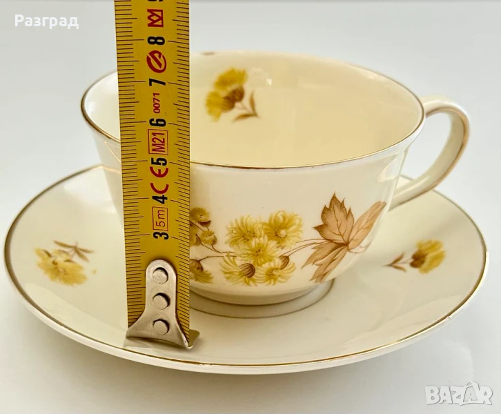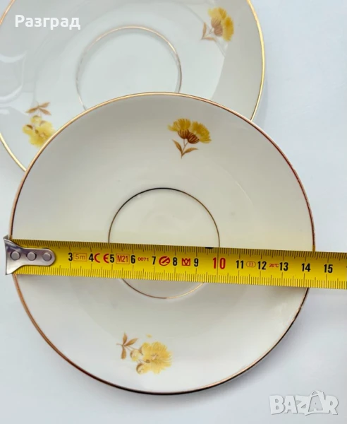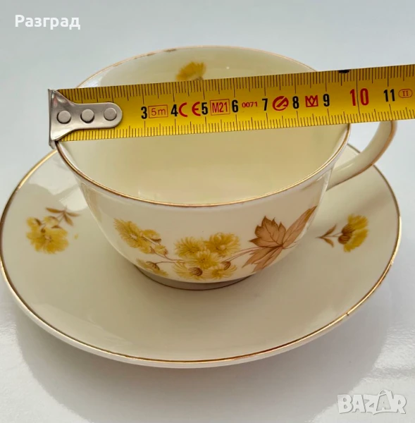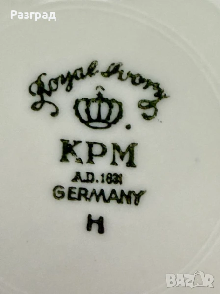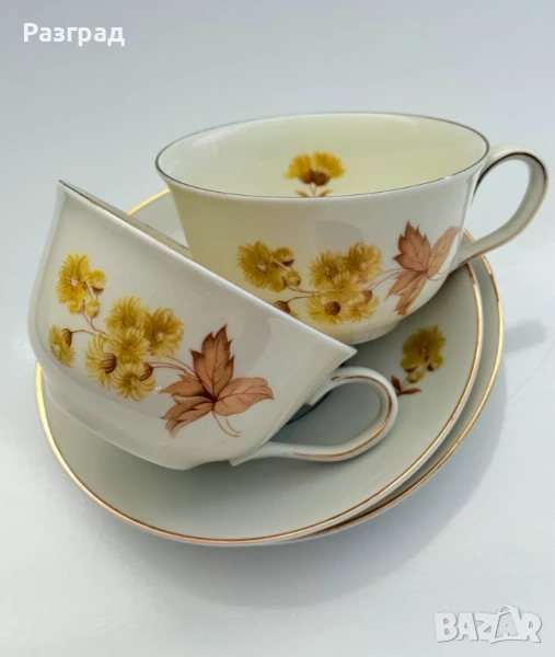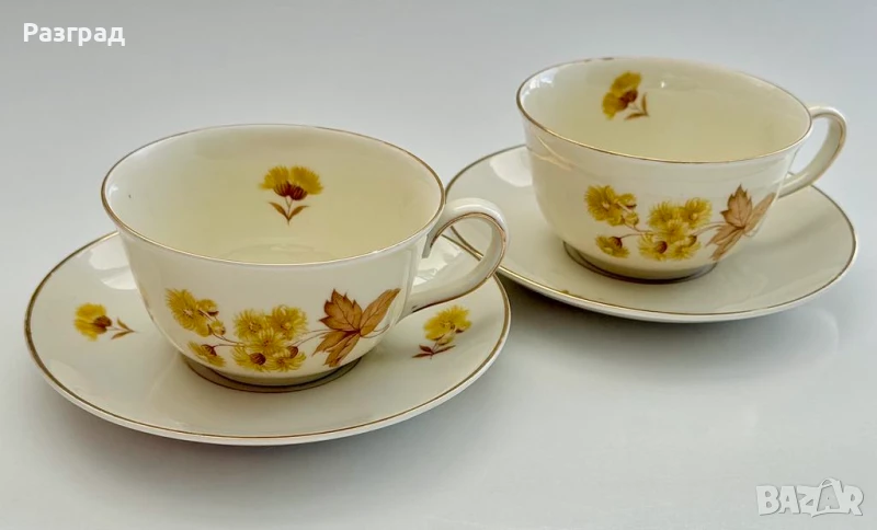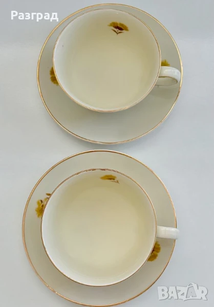 Два винтидж сета чашки с чинийки, подходящи за чай или дълго кафе. Вместимост 200-220мл. Произведени в Германия в началото на миналия век от KPM - Königliche Porzellan-Manufaktur (Royal Porcelain Manufactory). Порцеланът е в цвят слонова koст. В чудесно винтидж състояние, с леки следи от времето по златният кант.