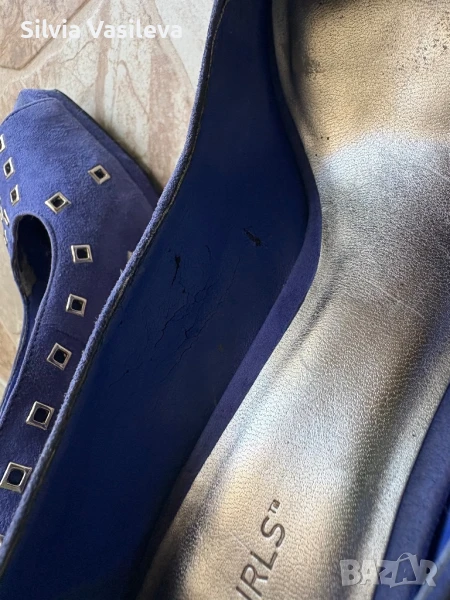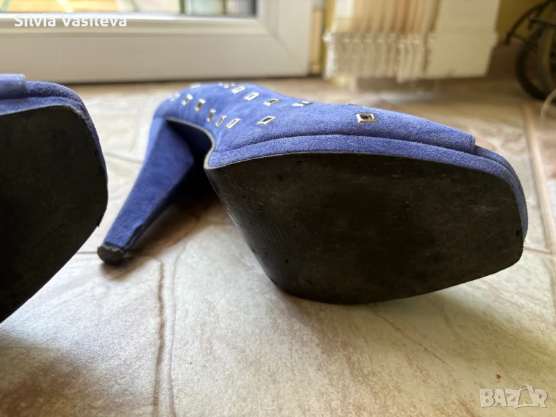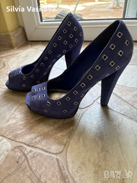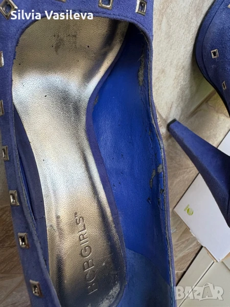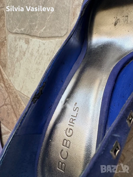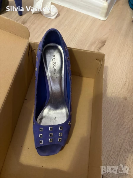 Дамски обувки на висок ток BCBGMAXAZRIA girls номер 37 1/2 . Закупени от Лас Вегас. Носени са преди години. Не ми стават и ги продавам . Външната част е естествен велур. Цвят между синьо и лилаво - индиго. Вътрешната част е от изкуствена кожа . Има обелени участъци само отвътре. Вижда се на снимките. Много са удобни. Размер на тока - 12 см.