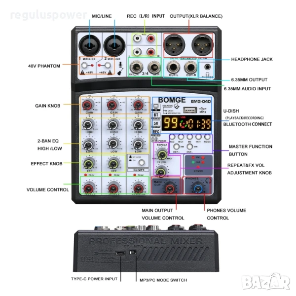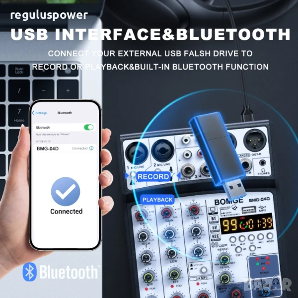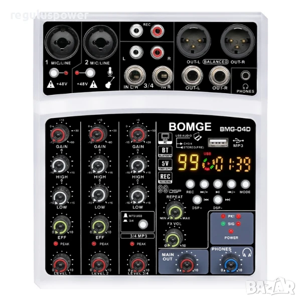 Професионален 4-канален аудио миксер, BOMGE BMG-04D DSP 99 FX UPGRADE разполага с два моно входа, които позволяват както XLR, така и небалансиран 1/4″ жак с 48V фантомно захранване, един стерео вход и един USB/Bluetooth вход с 6.3 мм XLR и RCA жакове за свързване на различни устройства, като например безжичен микрофонен приемник, кондензаторен или динамичен микрофон, китара или други инструменти и др., записващи аудио на USB устройство или компютър. DJ звуковият контролер може да се записва на компютър, USB диск или мобилен телефон, а миксерът се предлага с вградена звукова карта и аудио интерфейс. Той съдържа USB конектор за аудио изход и вградени контроли за запис. Потребителите могат безжично да стриймват музика от таблет или телефон, използвайки този миксер. Вградени са контроли като възпроизвеждане/пауза, смяна на песни и режими. За да миксирате и записвате звуковия изход от миксера към други устройства, този аудио миксер може да бъде свързан чрез външен USB, компютър или лаптоп, флаш устройство или Bluetooth устройство.