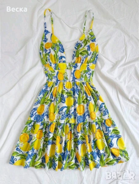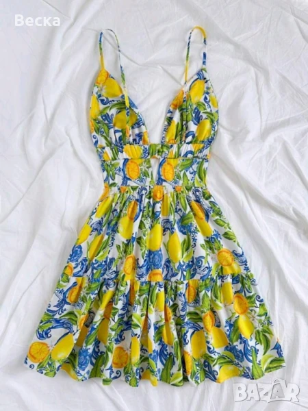 Продава се чисто нова лятна рокля с тънки презрамки и красив, свеж принт на лимони, зелени листа и сини орнаменти. Идеална за плаж, разходка или лятна почивка!