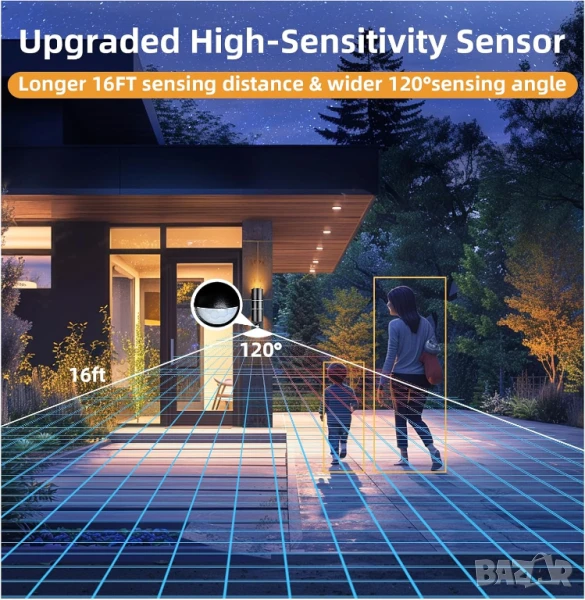 Оборудвана с високочувствителен сензор, съчетаващ движение и фотоклетка, тази стенна лампа осигурява широкоъгълен изглед от 120° и откриване на 5 метра разстояние. Автоматично светване за 60 секунди при слаба светлина <20-25 лукса, задействано от движение, осигурявайки цялостно покритие и ефективно осветление за всеки ъгъл на вашето външно пространство.