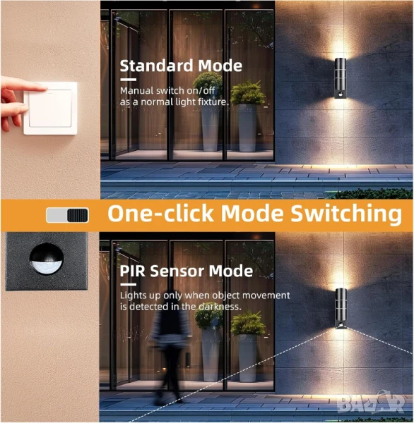 Изпитайте два иновативни режима – режим на PIR сензор за автоматично нощно осветление, пестене на енергия и безгрижие, и режим „Винаги включен“ за постоянно, уютно осветление. Перфектно външно осветление, превключвайте безпроблемно между режимите, за да отговарят на всяка ваша нужда във всяка външна обстановка.