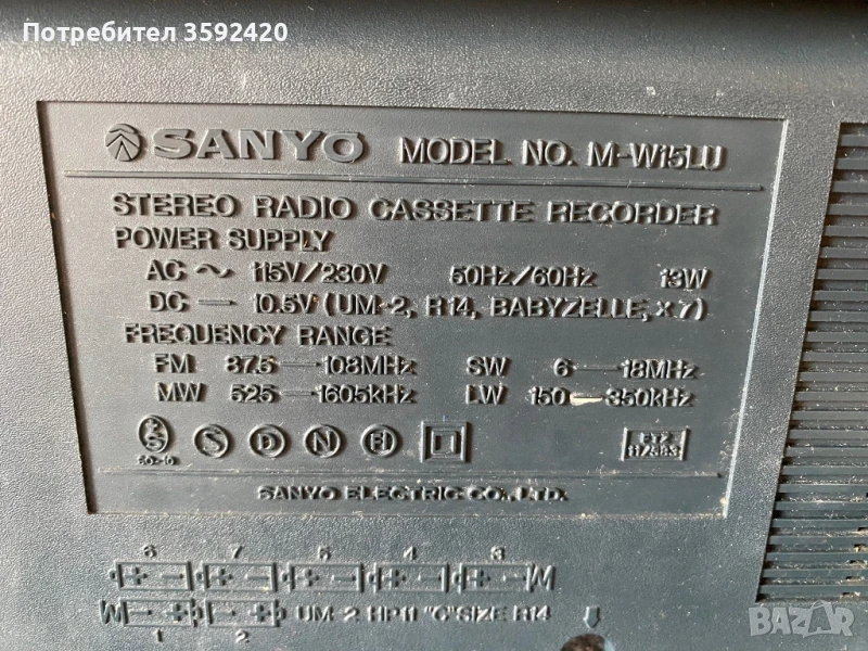 Sanyo M-W15LU. Добро външно състояние, без липси. Радиото работи. На касета и двете гнезда превъртат в едната посока, в другата се затрудняват, съответно и не възпроизвеждат