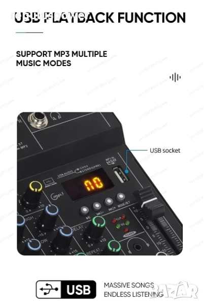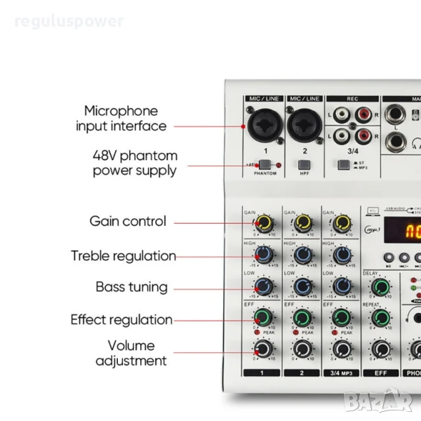 Смесителя е снабден с входно усилване и регулиране на високи и ниски честоти, вградено 48V фантомно захранване, подходящо за директно захранване на кондензаторни микрофони, изходен порт за слушалки с висока разделителна способност, mp3 плейър, Bluetooth приемник и вградена звукова карта .