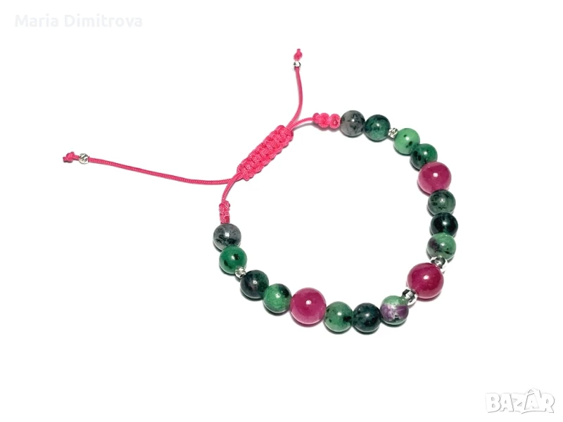 2 Снимка: Женска гривна с Рубин 8мм, Рубин Циозит 6мм, сребърни фасетирани мъниста 925, сребърни фасетирани стопери 925, дължина 12,5 - 25см - 27лв