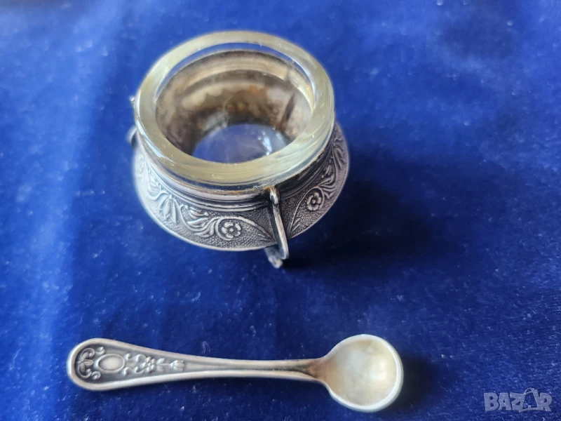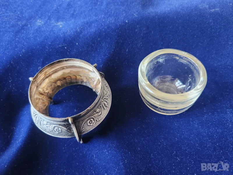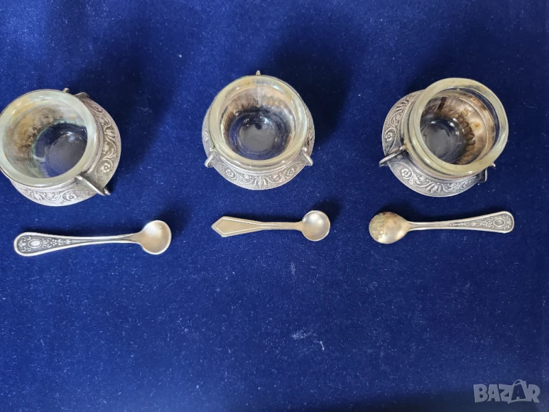 1) комплект от 3 малки стъклени съдчета за хайвер, горчица, подправки в обков от посребрен мелхиор на 3 крачета ( с релефен цветен мотив отстрани).