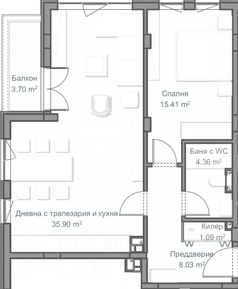 И така: голям двустаен апартамент с разпределение разположение и осветеност, които предоставят възмоността лесно да бъде отделена втора спалня (вижте схемата). Много добре разкроени, големи и правилни помещения - дневна зона с кухня над 350кв.м., спалня, баня с тоалетна, килер удобно входно антре с място за гардеробна и една тераса (тип лоджия). Топъл и светъл с големи прозорци и 25см. вътрешни преградни стени със съседите, АЛУМИНИЕВА дограма. Завъшен на шпакловка и замазка, с изолация и подготовка за подово отопление, ел. инсталация с ключове и контакти, ВиК на тапа, Входна блиндирана (и пожароустойчива) врата, домофонна система, декинг покритие на външните части. Общи части - завършени с гранит, мрамор, желязо и дърво. Към апартамента и в цената принадлежи и изба.