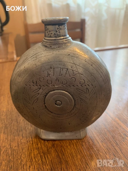 Старинна гръцка манерка от 1895 г. – масивен калай, ръчно гравирана, снимка 1 - Антикварни и старинни предмети - 51154839 Старинна гръцка манерка от 1895 г. – масивен калай, ръчно гравирана, снимка 2 - Антикварни и старинни предмети - 51154839 Старинна гръцка манерка от 1895 г. – масивен калай, ръчно гравирана, снимка 3 - Антикварни и старинни предмети - 51154839 Старинна гръцка манерка от 1895 г. – масивен калай, ръчно гравирана, снимка 4 - Антикварни и старинни предмети - 51154839 1/4