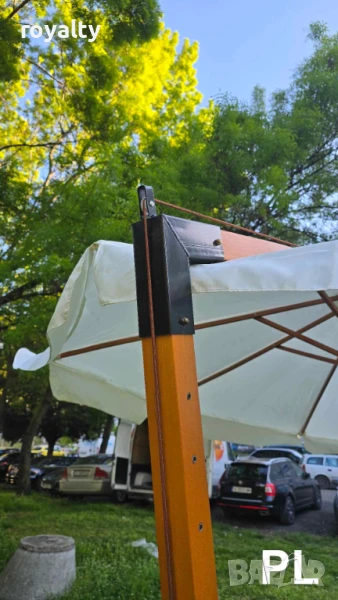 Дървеният прът е разположен извън сенника, така че да не пречи на пространството под чадъра. Градинският чадър се отваря и затваря лесно чрез манивелата.