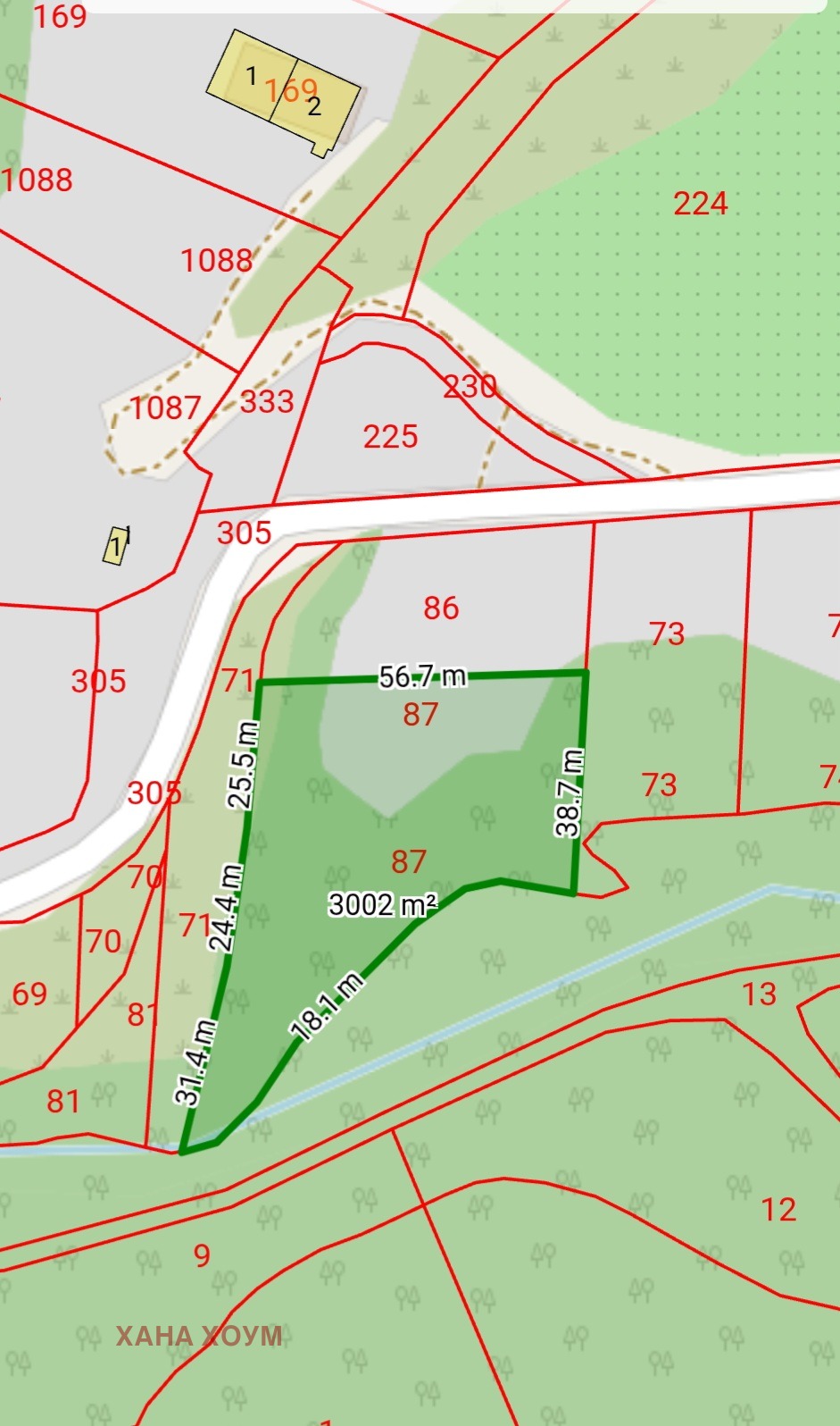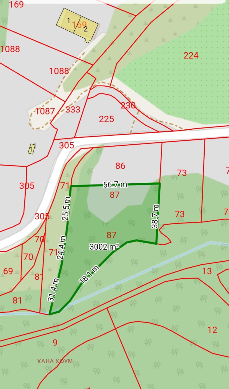 2. Земеделска земя - ливада, с площ 3000 кв.м. Намира се зад имота в регулация и двата заедно съставляват 4314 кв.м.