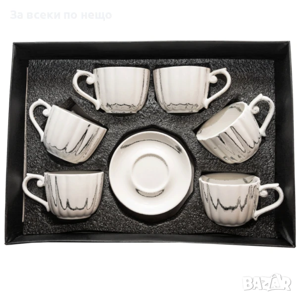Сервиз от шест чаши с чинийка за топли напитки, чай или кафе, в красива картонена кутия.Практичен и стилен избор за ежедневна употреба или за посрещане на гости.