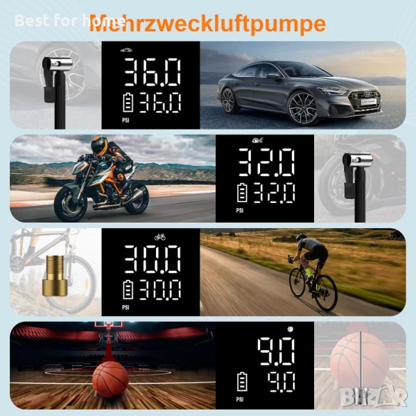 4 режима на употреба и 4 единици за въздушно налягане: преносимият електрически въздушен компресор ви предлага 4 различни режима на употреба, за да отговори на вашите индивидуални нужди; можете да регулирате и съхранявате единиците и предварително зададените стойности отделно за автомобили, мотоциклети, велосипеди, топки и ръчен режим; Освен това можете да избирате от 4 различни единици за въздушно налягане (PSI, BAR, KPA, kg/cm2). Постигнато подобрение постигнато постигнато Автоматично изключва помпата, за да се избегне пренадуване.