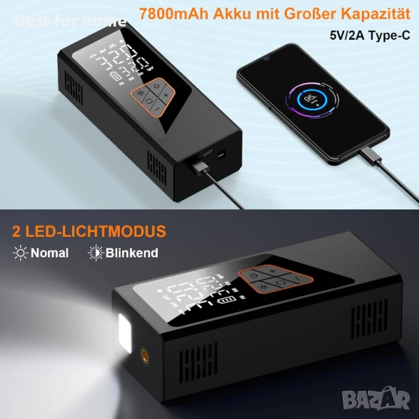 Мобилно захранване и аварийно осветление: нашата батерийна въздушна помпа е не само компресор, но и практично мобилно захранване; благодарение на вградената батерия можете да зареждате устройствата си в движение, като например смартфон, таблет или други електронни устройства; Освен това, горната част на въздушната помпа е оборудвана с LED светлини, които ви осигуряват допълнителна безопасност при спешни случаи;