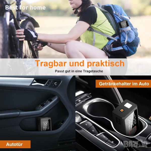 DC 12 V и безжичен компресор с батерия: нашата електрическа въздушна помпа може да се захранва чрез DC 12 V връзка във вашия автомобил, както и с вградената батерия; ако безжичната въздушна помпа вече няма захранване, можете лесно да я захранвате чрез запалката на колата си и да напомпвате директно гумите на автомобила си (моля, уверете се, че двигателят на колата ви работи); идеална е и като аварийна гума.
