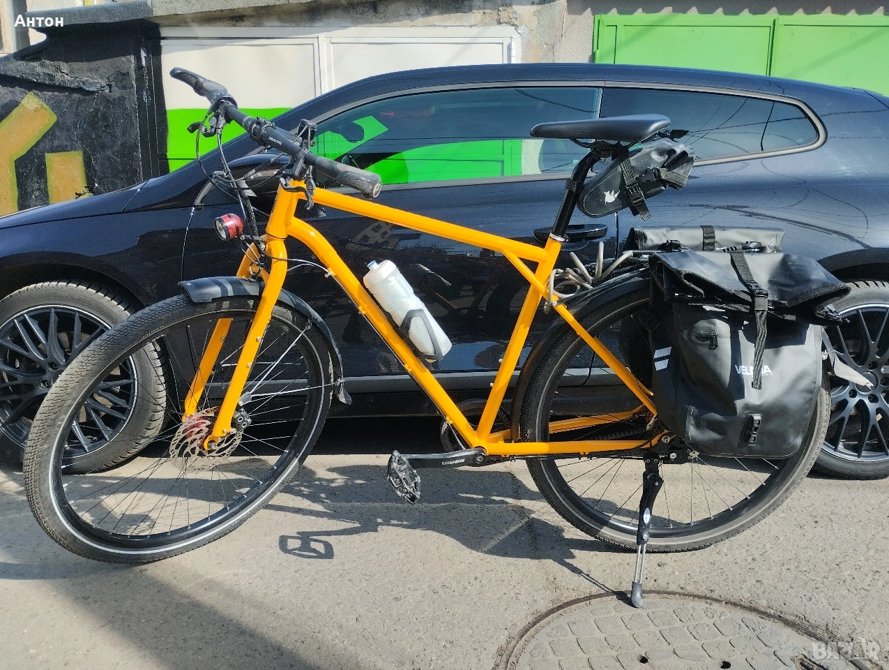 Продавам уникален велосипед за дълги преходи и вело туризъм.Велосипедът е със стоманена рамка размер L.Оборудван е с хидравлични дискови спирачки на Magura,задна главина Rohloff 500 14 скоростна,гуми Shwalbe marathon 50/622-28",ремачно задвижване на Gates и курбел Sram 175mm. дължина.Всичко работи отлично!Продава се само лично!Срещу 100€ мога да добавя нови дисаги,виждат се на последната снимка!