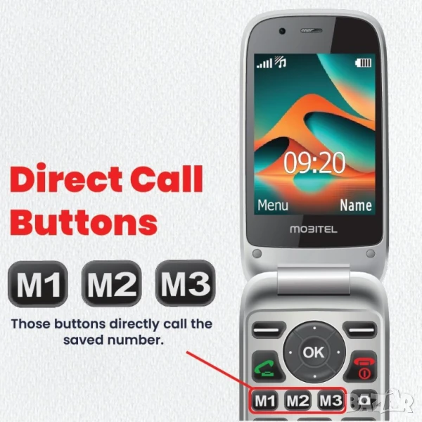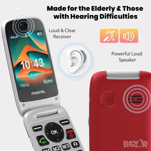 Проектиран с мисъл за възрастните хора, този телефон разполага с ярък 2,8-инчов екран, големи бутони и опростено меню за лесна употреба, заедно с бързо набиране на снимки и SOS бутон за бърз достъп при спешни случаи. Той предлага силен и ясен звук с мелодии с висока сила на звука, удобно зарядно устройство, дълъг живот на батерията и дистанционна конфигурация чрез специално приложение, което позволява на семейството или болногледачите да управляват настройките от разстояние.