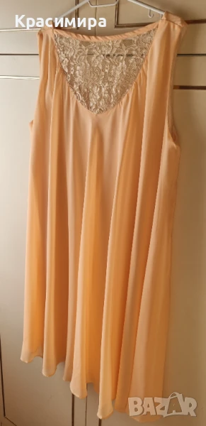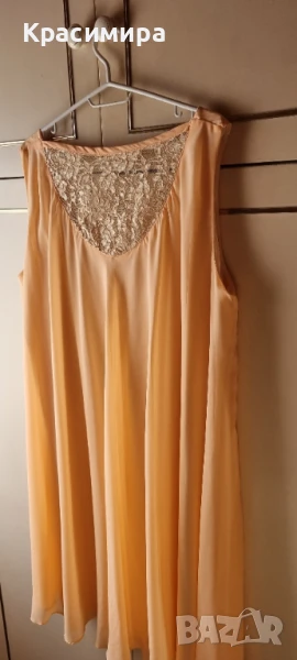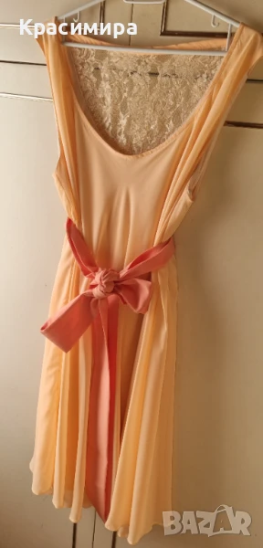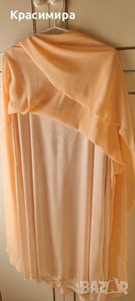 Роклята пада свободно има и колан към нея при желание може да се слага.Материята е сатенена има подплата на гърба има дантела за повече елегантност. Моделът става за по-пищни и пълни дами.Цвета е праскова шита е по-поръчка размера е относителен.Обичана 2 пъти за поводи.