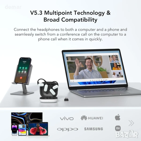 Изработени от мек, нежен към кожата силикон, тези леки слушалки с отворени уши предлагат сигурно и ергономично прилягане за комфорт през целия ден по време на всяка дейност. Те осигуряват завладяващ звук с дълбоки баси и ясни разговори благодарение на ENC шумопотискането. В допълнение към Bluetooth 5.3, USB-С адаптерът осигурява стабилна връзка с ниска латентност за безпроблемни срещи и игри на различни устройства. Батерията издържа до 10 часа с едно зареждане, с допълнителни 35 часа от кутията, и се зарежда напълно само за 2 часа. Дизайнът с отворени уши осигурява ситуационна осведоменост за допълнителна безопасност, а свързаността с две устройства позволява плавна многозадачност без повторно сдвояване.